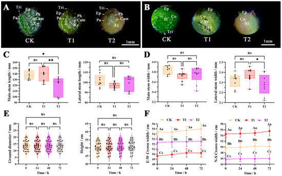 Changes in stem appearance, anatomical structure, and morphological indicators of B. glabra ‘Elizabeth Angus’. (A) Petiole transverse structure under an optical microscope. (B) Stem transverse structure under an optical microscope. Note: Tri. trichomes; Ep. epidermis; Co. cortex; St. stele; Pa. parenchyma; Ph. Phloem; Cam. Cambium; Xy. xylem. Scale bar = 1 mm. (C) Main and lateral stem length. (D) Main and lateral stem width. (E) Ground diameter and height (sample data from CK T1 and T2 simultaneously). (F) E-W and N-S crown width Note: The values are means ± SD (n = 3); ns indicates that no significant difference in the same indicator between different treatments (p > 0.05); The differences were compared by Duncan’s test, capital letters and ** indicate highly significant differences in the same indicator between different treatments (p < 0.01); small letters and * indicate significant differences in the same indicator between different treatments (p < 0.01). This applies to the rest of the text hereafter.