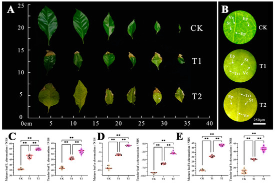 Changes in leaf appearance, anatomical structure, and color differences indicators. (A) Morphological changes of mature and tender leaves. (B) Leaf surface structure under an optical microscope. Note Ve. vein; Ep. epidermis; St. stoma; Tri. trichomes. Scale bar = 250 μm. (C) Leaf L chromatism value. (D) Leaf a chromatism value. (E) Leaf b chromatism value. Note: ** indicates highly significant differences in the same indicator between different treatments (p < 0.01).