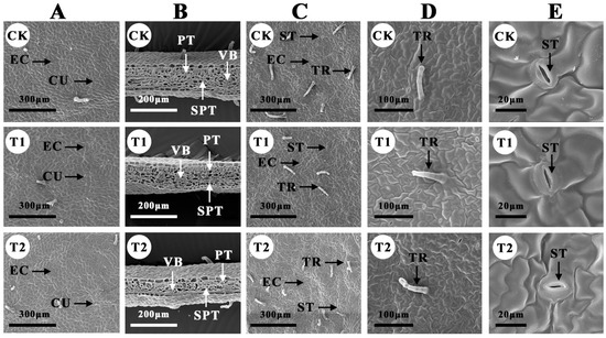 Changes in B. glabra ‘Elizabeth Angus’ blade microstructure under different fumigation times of treatments observed by SEM. (A) Upper surface, scale bar = 300 μm. (B) Crosscutting structure, scale bar = 200 μm. (C) Lower surface, scale bar = 300 μm. (D) Trichomes, scale bar = 100 μm. (E) Stomata, scale bar = 20 μm. Note: EC, epidermal cells. CU, cuticle. VB, vascular bundle. PT, palisade tissue. SPT, spongy tissue. TR, trichomes. ST, stomata.