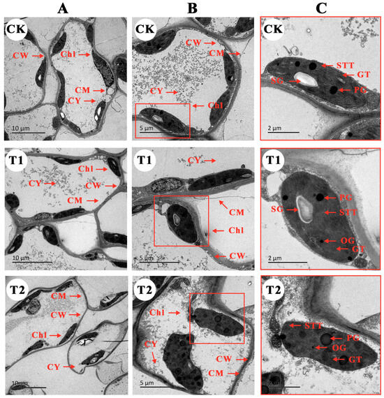 Changes in B. glabra ‘Elizabeth Angus’ blade cell ultrastructure under different fumigation times of treatments observed by TEM. (A) Overall cellular structure, scale bar = 10 μm. (B) Local cellular structure, scale bar = 5 μm. (C) Chloroplast, scale bar = 2 μm. Note: CK, control treatment without NO2. T1, 4 μL·L−1 NO2 (8 h/d). T2, EC, 4 μL·L−1 NO2 (24 h/d). CW, cell wall. CM, cell membrane. CY, cytoplasm. Chl, chloroplast. SG, starch granules. PG, proteinoplast granules. OG, osmiophilic granules. GT, granular thylakoid. STT, stroma thylakoid.