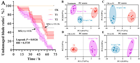 Leaf damage situation correlation heatmap of significant differences in B. glabra ‘Elizabeth Angus’ indicators under different fumigation times treatments. (A) Change of undamaged blade ratio. MS. median survival; HR. hazard ratio. (B) Principal component analysis (PCA) of response indicators under different treatments. (C) PCA scatter scores for CK and T1. (D) PCA scatter scores for CK and T2. (E) PCA scatter scores for T1 and T2.