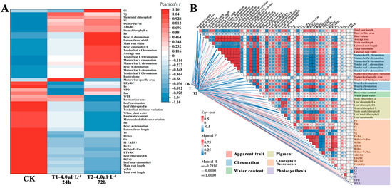 Cluster analysis of the correlation between different indicators and treatments. (A) Correlation between indicators analyzed by Pearson index method. (B) Clustering of indicators and treatment groups based on correlation. Note: Red represents a positive correlation between indicators. Blue represents the negative correlation between indicators. The depth of color is directly proportional to the absolute value of the correlation coefficient.