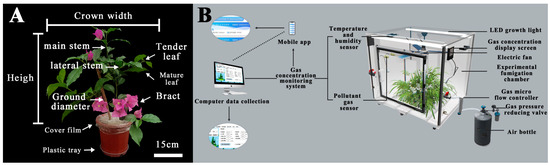 Experimental plant materials and fumigation test equipment. (A) B. glabra ‘Elizabeth Angus’ (2-year-old cutting seedling). Scale bar = 15 cm. (B) Schematic diagram of NO2 fumigation test device.