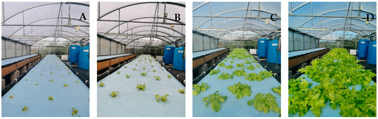 Growth stages of L. sativa (cv. Foglia di Quercia Verde) plants in the aquaponics system. From left to right: 30 (panel (A)), 45 (panel (B)), 55 (panel (C)), and 65 (panel (D)) days after sowing.