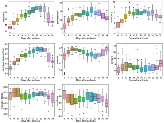 Shape traits. Box plots of area, perimeter, radius, equivalent diameter, eccentric, compact, rectangle degree, and roundness dynamic after anthesis, where different colored boxes represent different days after anthesis.