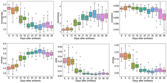 Texture traits. Box plots of homogeneity, dissimilarity, correlation, entropy, ASM, and energy dynamic after anthesis, where different colored boxes represent different days after anthesis.