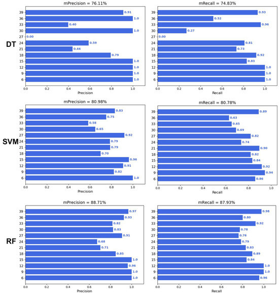 To verify whether machine learning can predict the DAA, three machine learning algorithms, including Decision Trees (DTs), Support Vector Machines (SVMs), and Random Forest (RF), were applied to predict the DAA. The results showed that the performance of the three machine learning algorithms was ranked as RF > SVM > DT (Figure 4). The average precision and recall of the DT, SVM, and RF were 76.11% and 74.83%, 80.98% and 80.78%, and 88.71% and 87.93%, respectively. In addition, the precision and recall of the three algorithms were higher at 6–15 days and 39 days, while the precision and recall were lower at 21–33 days.