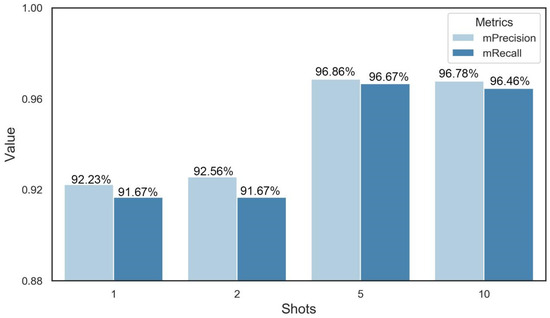 In order to reduce our dependence on a number of datasets, we further explored the performance of few-shot learning at predicting DAA. The results showed that the mean precision and mean recall of 1-shot were 92.23% and 91.67%, respectively. In addition, the precision and recall increased as the number of query sets increased. After 5-shot, the gain in the model’s performance started to become minuscule. In the end, the precision and recall of 5-shot were 96.86% and 96.67%, which was the optimal shot number (Figure 7).