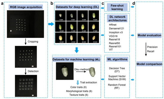 Deep learning is an end-to-end model structure, which can directly use raw RGB images as its input. The coordinate information of each grain is obtained based on the bounding boxes. A crop tool was used to crop the original images and save each grain as a 250 × 250 resolution image. These images were categorized and grouped into different folders according to their DAA (Tables S1 and S2, Figure S1). Finally, these images were randomly split into the training dataset, validation dataset, and testing dataset at proportions of 70%, 10%, and 20%, respectively.