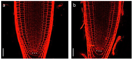 Root meristem phenotype in wild type (a) and cas-c1 mutant (b). Seedlings were grown for 7 d on MS medium supplemented with sucrose in vertical plates. Representative images are shown. *** indicate QC cells. Propidium iodide was used to visualize cell walls. Scale bars are 200 µm.