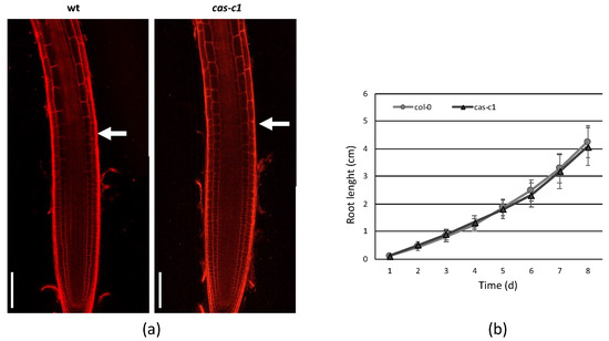 For root meristem analysis, wild-type and cas-c1 mutant plants were grown for 7 days in vertical MS medium plates. Roots were then stained with 10 mg/mL propidium iodide (PI) and observed using a 20× objective with a Zeiss (Oberkochen, Germany) LSM 880 laser scanning confocal microscope. Excitation and detection window were set as follows: excitation at 561 nm and detection at 570–650 nm.