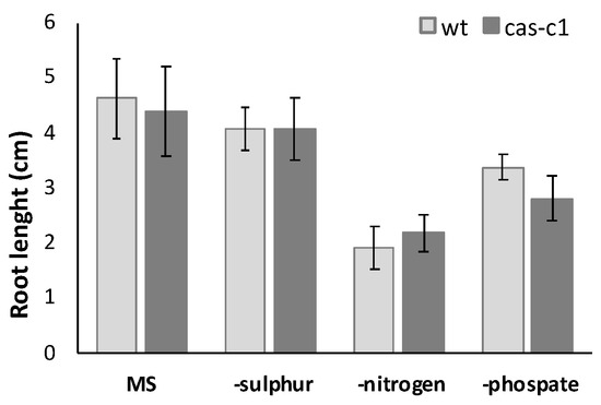 Root length measurement in nutrient deficient media. Wild-type and cas-c1 mutant seedlings were grown for 9 d in vertical plates of MS medium or MS medium in the absence of different nutrient compounds. Root length was measured with ImageJ 1.51j8 software. Values are means ± SD of three independent experiments; ANOVA.