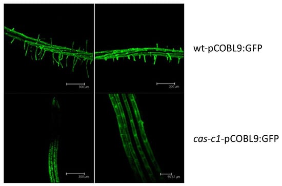 Because cas-c1 has a severe defect in root hair morphogenesis [23,24], we hypothesized that it may also have altered root hair cell fate. To visualize root hairs during development, we crossed into cas-c1 the COBRA-like protein 9 (COBL9) promoter driving GFP, which is root hair specific [30,31]. The cas-c1-pCOBL9:GFP line showed a normal patterning of green fluorescence (Figure 4), both in its abnormal root hairs and in its root hair primordia, indicating that the patterning of root hair formation is not altered in this mutant. Thus, cas-c1 affects root hairs exclusively in their elongation.
