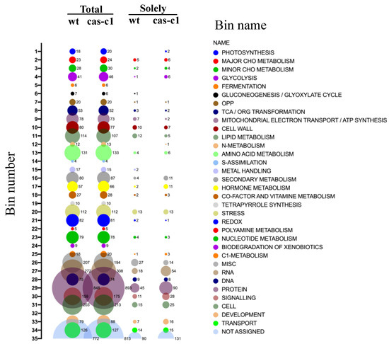 Bubble plot of the functional classification of the identified proteins according to the plant-specific database MapMan. Bubble columns represent the proteins classified within each bin of the total proteins identified in wild-type (wt), cas-c1 root hair samples, and those only present in wt or cas-c1 root hair samples. Numbers beside the bubbles represent the amount of proteins classified within the bin.