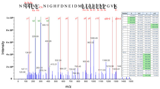 LC-MS/MS mass spectra of the tryptic peptide containing the cyanylated Cys346 residue of the S-Adenosyl homocysteine hydrolase SAHH1/HOG1 protein. The table contains the predicted ion type for the modified peptide, and the ions detected in the spectrum are highlighted in green color.