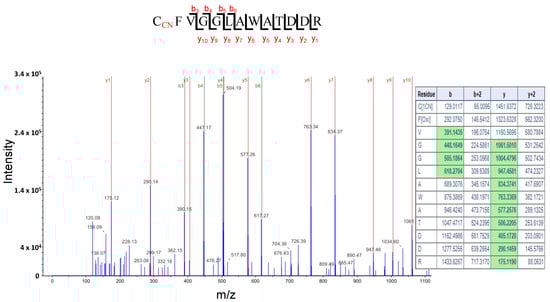 LC-MS/MS mass spectra of the tryptic peptide containing the cyanylated Cys10 residue of the Glycine Rich Protein 7, (GRP7). The table contains the predicted ion type for the modified peptide, and the ions detected in the spectrum are highlighted in green color.