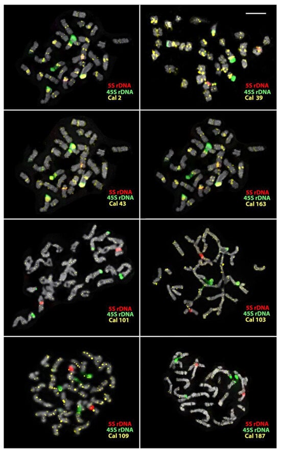 In C. stellata, large clusters of Cal 2 and Cal 43 were localized in the pericentromeric regions of all chromosomes. Additionally, Cal 2 and Cal 43 clusters were observed in the distal region of the chromosome pair 7 (short arms), and also small polymorphic clusters of Cal 43 were revealed in the terminal regions of the chromosome pairs 3, 4, and 5. Large Cal 163 clusters were revealed in the pericentromeric regions of all chromosomes and occupied the whole short arms of the chromosome pairs 1, 2, and 6 (Figure 5).