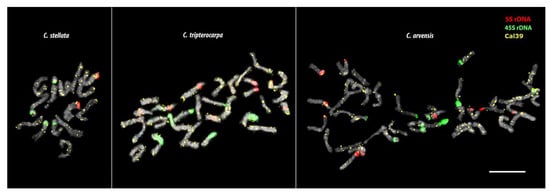 Metaphase plates of C. stellata, C. tripterocarpa and C. arvensis after multicolour FISH with 45S rDNA (green), 5S rDNA (red), and Cal 39 (yellow). Scale bar—5 µm.