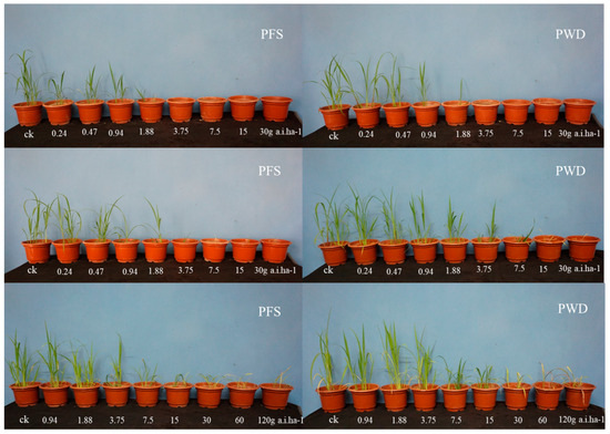 Photographs of barnyard grass after 21 days of treatment with different doses of penoxsulam by post-emergence foliar spraying (PFS) and water-dispersal application (PWD). The first, second, and third rows represent E. crus-galli at 1- (first row), 3- (second row), and 5-leaf stages (third row), respectively.