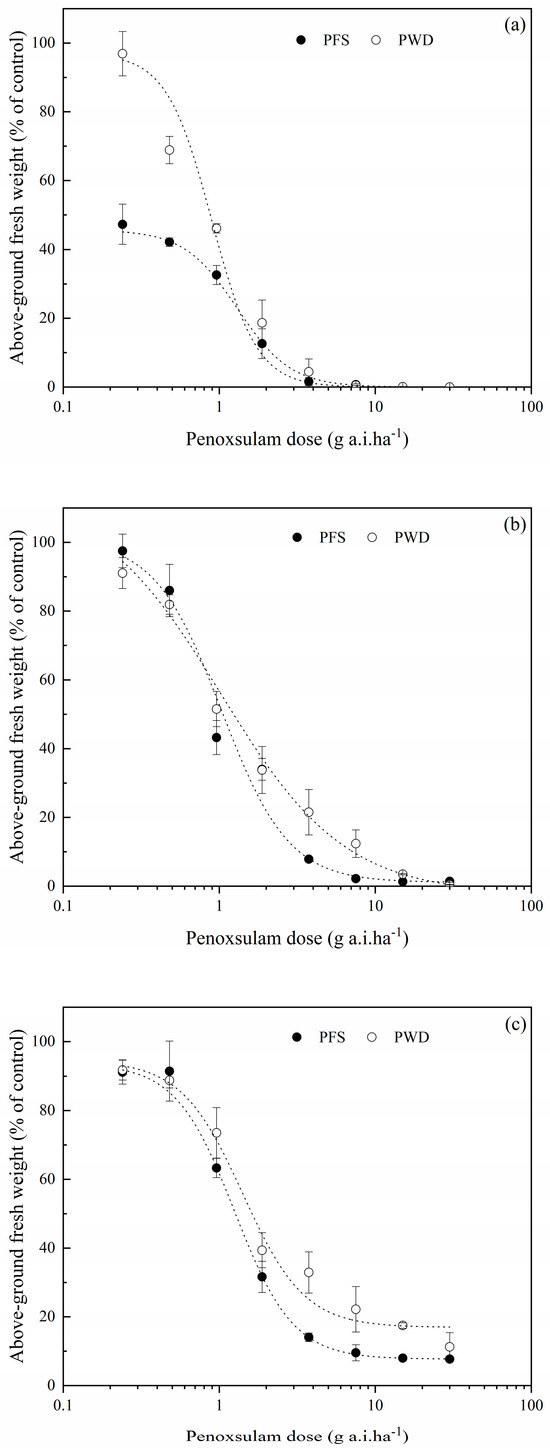 Dose–response curve of E. crus-galli at 1-leaf stage (a), 3-leaf stage (b) and 5-leaf stage (c) at different doses of penoxsulam by post-emergence foliar spraying (PFS) and water-dispersal application (PWD). Each point represents the mean ± SE of twice-repeated experiments, each including three replicates.