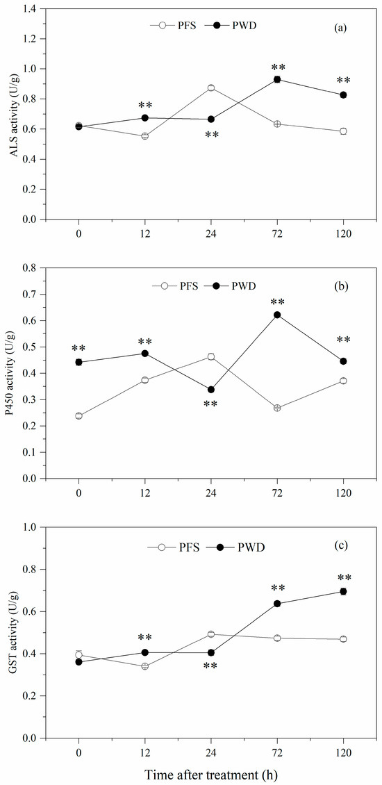 Activity of ALS (a), P450 (b), and GST (c) at 0, 12, 24, 72, and 120 h after treatment with penoxsulam by post-emergence foliar spraying (PFS) and water-dispersal application (PWD). Each point refers to mean ± SE of twice-repeated experiments, each including three replicates. The significance between the two methods was detected by t-tests (** p < 0.01).