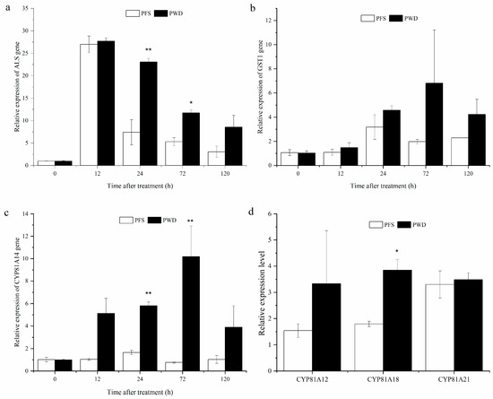 The gene expression levels of ALS (a), GST1 (b), and CYP81A14 (c) at different time intervals, and the relative gene expression levels of CYP81A12, CYP81A18, and CYP81A21 after 24 h treatment by post-emergence foliar spraying (PFS) and water-dispersal application (PWD) of penoxsulam treatment (d). Data are presented as mean ± SE; significant differences between the two methods were detected by t-tests (* p < 0.05, ** p < 0.01).