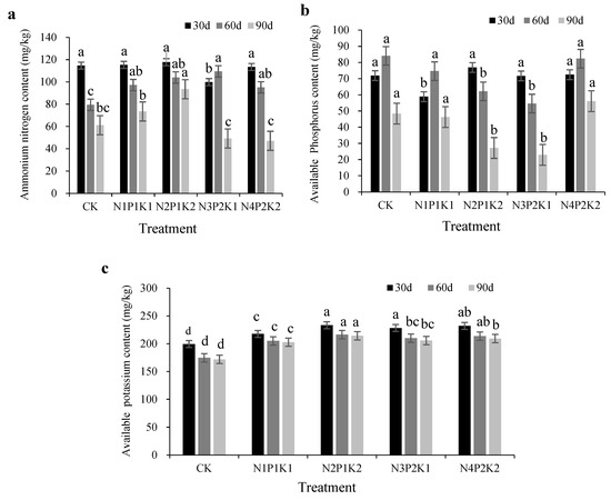 Effect of different NPK ratios on the available nutrient content of chrysanthemum cultivation soil. Note: (a) is the content of ammonium nitrogen (N), (b) is the content of available phosphorus (P); (c) is the content of available potassium (K). Different lowercase letters on bar chart indicate significant differences among the treatments (p < 0.05).