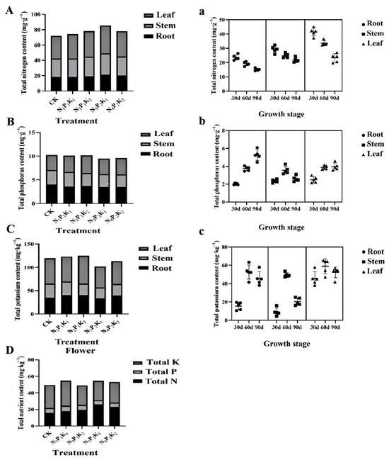 Effects of different NPK ratios on the uptake and tissue distribution of N, P, and K in chrysanthemum plants: (A,a) total nitrogen (N) content and N distribution in different organs and growth stages; (B,b) total phosphorus (P) content and P distribution in different organs and growth stages; (C,c) total potassium (K) content and K distribution in different organs and growth stages; (D) total contents of N, P, and K in flowers. (A–D) correspond to differences of total nitrogen in root + stem + leaf, total phosphorus, and total potassium in root + stem + leaf between treatments at the flowering stage; (a–c) correspond to differences of total nitrogen, total phosphorus, and total potassium content between seedling (30 d), reproductive (60 d) and flowering stages (90 d) in the root, stem, and leaf, respectively.