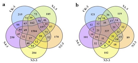 The application of different NPK ratios significantly increased the bacterial richness and diversity in the chrysanthemum rhizosphere. After further screening and clustering based on the 97% similarity threshold, a total of 4055 bacterial OTUs were observed in CK3, N1-3 (N1P1K1), N2-3 (N2P1K2), N3-3 (N3P2K1), and N4-3 (N4P2K2) in the flowering stage (Figure 3). The 1504 shared OTUs (Figure 3a) accounted for 37.1% of the total OTUs. The N3P2K1 treatment displayed a higher number of unique OTUs (n = 284) than the other treatments. A total of 1215 fungal OTUs were observed in the treatments. The 337 shared OTUs accounted for 27.7% of the total observed fungal OTUs (Figure 3b). CK3 and N1-3 had more unique OTUs than the other treatments, indicating that the addition of NPK resulted in fewer fungal species than in CK.