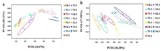 Principal coordinates analysis (PCoA) plot of (a) bacterial and (a) fungal community structures based on Bray–Curtis differences.