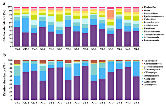 Relative abundance of (a) bacterial and (b) fungal phyla in the chrysanthemum rhizosphere using different NPK fertilization ratios.