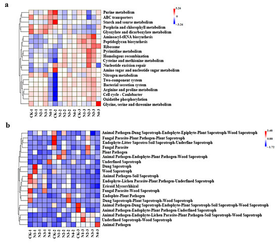 Heatmap of bacterial (a) and fungal (b) distribution of the top-20 most abundant gene-predicted functional profiles in the KEGG pathway present in the chrysanthemum rhizosphere soil using various NPK ratios. Red and green represent high and low enrichment of function abundance, respectively.