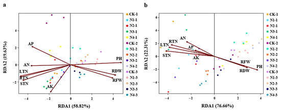 Redundancy analysis (RDA) demonstrating the relationships between soil environmental factors, growth indexes, and (a) soil bacterial and (b) fungal community structures among soil samples. Note: PH, RFW, and RDW indicate plant height, root fresh weight, and root dry weight, respectively. AN, AP, and AK indicate soil ammonium nitrogen, available phosphorus, and potassium, respectively. RTN, STN, and LTN indicate the total nitrogen content of roots, stems, and leaves, respectively.
