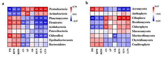 Correlation coefficients between soil environmental factors, growth indices, and relative abundances of bacterial (a) and fungal (b) communities in chrysanthemum rhizosphere. Notes: Significant correlation coefficients are indicated * p < 0.05 and ** p < 0.01 based on Pearson’s correlation test. PH, RFW, and RDW indicate plant height, root fresh weight, and root dry weight, respectively. AN, AP, and AK indicate soil ammonium nitrogen, available phosphorus, and potassium, respectively. RTN, STN, and LTN indicate the total nitrogen content of the roots, stems, and leaves, respectively.
