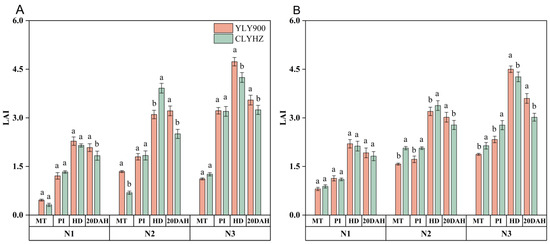 The leaf area index (LAI) of two panicle-type varieties under different N rates at Jingzhou in 2020 (A) and 2021 (B). Vertical bars indicate standard errors (n = 3). MT: middle tillering, PI: panicle initiation, HD: heading stage, and 20 DAH: 20 days after heading stage. Means with identical letters within each column do not exhibit statistically significant differences according to LSD (0.05).