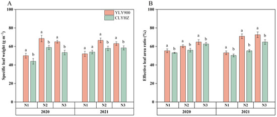 The specific leaf weight (SLW) (A) and effective leaf area ratio (B) of two panicle-type varieties during the heading stage under different N rates at Jingzhou in 2020 and 2021. Vertical bars indicate standard errors (n = 3). Means with identical letters within each column do not exhibit statistically significant differences according to LSD (0.05).