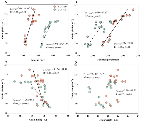 Relationships between grain yield and panicle number (A), spikelets per panicle (B), grain filling (C), and grain weight (D) in 2020 and 2021.