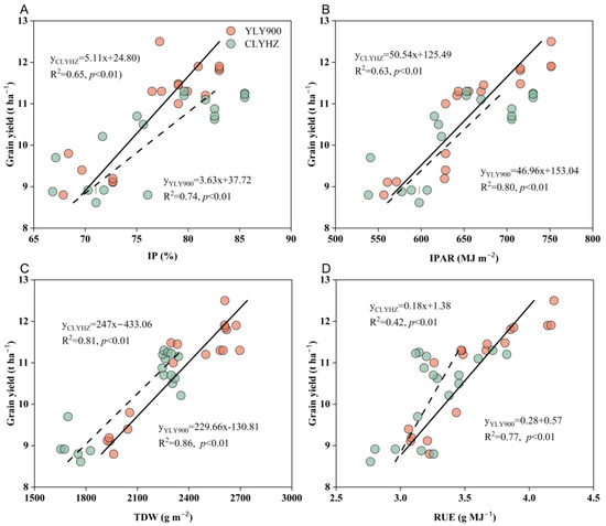 Across varieties, IP, IPAR, TDW, and RUE were all significantly (p < 0.01) positively linked with grain yield. (Figure 6). For YLY900, R2 = 0.86 was the coefficient of determination between grain yield and TDW (p < 0.01), and R2 = 0.74 for CLYHZ. The YLY900’s IPAR and grain yield correlation coefficients were R2 = 0.80 (p < 0.01) and R2 = 0.63 (p < 0.01) for CLYHZ. The correlation coefficients of grain yield with RUE and IP for YLY900 were R2 = 0.77 and R2 = 0.74, respectively, and R2 = 0.42 and R2 = 0.65 for CLYHZ.