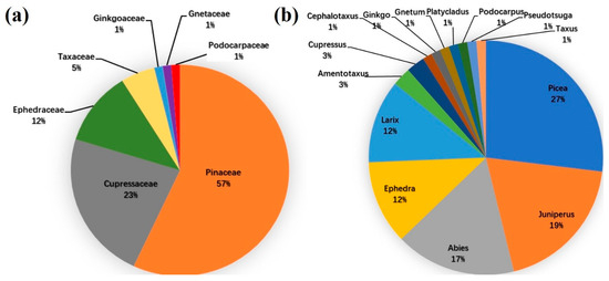 Percentages of (a) families and (b) genera of gymnosperm species in the Qinghai–Tibet Plateau.