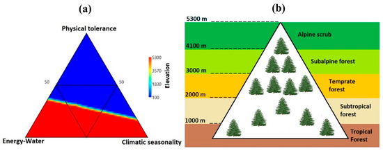 Ternary plots were used to visualize the relationships among three predictor variables, i.e., climatic seasonality (CS), energy–water (EW), and physical tolerance (PT), along the elevational gradients. It is clearly illustrated that physical tolerance predictors were significantly higher at lower elevation gradients (Figure 2a), while energy, water and climatic seasonality predictors were found to be higher at higher elevation gradients (Figure 2a).