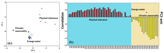 The first two components have a 99.6% variance, according to PCA (principal component analysis), whereas the PC1 and PC2 axes have 98.2% and 1.4% variations, respectively (Figure 3a). At lower elevation gradients, a positive correlation was observed between the PC2 component and the physical tolerance (PT) variable (Figure 3b). At higher elevation gradients, a negative correlation was observed between the energy–water (EW) and climatic seasonality (CS) variables (Figure 3b).