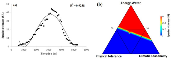 (a) Gymnosperm species richness in the Qinghai–Tibet plateau (black circles) with the best fit of the polynomial curve (dotted line). The explanatory power of the regression model is represented by R2 value (p < 0.001). (b) Ternary plot shows the relative contributions of climatic seasonality (CS), energy–water (EW) and physical tolerances (PT) to patterns of gymnosperm species distribution along the elevation gradients in the Qinghai–Tibet Plateau.