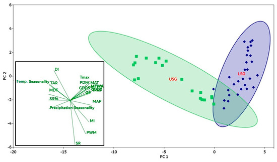 Plot of environmental variables in the PCA conducted with GDD5 (annual growing degree days above 5 °C), GDD0 (annual growing degree days above 0 °C), GP (growing season precipitation), AP (annual precipitation), MAT (annual mean temperature), SSP (solar radiation %), MI (moisture index), DI (drought index), Tmin (minimum temperature), MTCM (minimum temperature of the coldest month), Tmax (maximum temperature), MTWM (maximum temperature of the warmest month), PDM (precipitation of the driest month), PWM (precipitation of the wettest month), PS (precipitation seasonality), TS (temperature seasonality), TAR (annual temperature range), and MDR (annual mean diurnal range) in lower sub-gradients (LSG, purple color) and upper sub-gradients (USG, green color) in the Qinghai–Tibet Plateau. Based on the mid-elevation curve at 3200 m, the whole gradient was divided into two groups of 100–3200 m (LSG) and 3300–5300 m (USG), and both were analyzed simultaneously in the principal component analysis. Loadings of environmental variables in PCA show the correlation with PC1 and PC2. The length of the green line represents the total contribution of climatic factors to the analysis. The direction of the green line illustrates the association of environmental variables with each axis (vector lines parallel to an axis are significantly connected with that axis). Correlations between climatic factors are shown by the angles between vector lines.