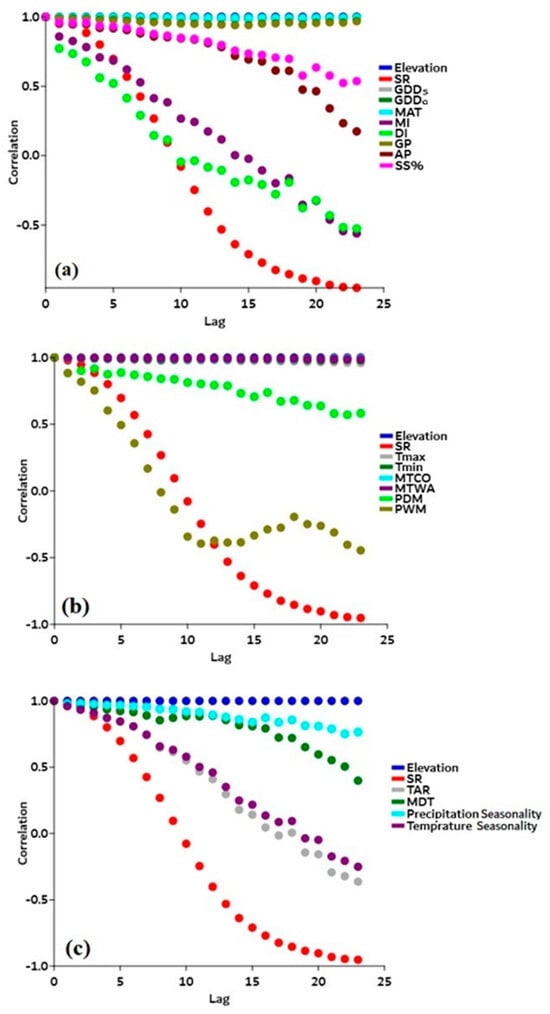 Spatial autocorrelation graphs show the significant association between predictor variables (dependent variables), species richness (SR), and elevation (independent variables). (a) Energy–water variables (i.e., GDD5 (growing degree days of daily temperature > 5 °C, gray dots), GDD0 (growing degree days of daily temperature > 0 °C, dark green dots), MAT (mean annual temperature, aqua dots), GP (growing degree days, golden dots), AP (annual precipitation, maroon dots), SSP (sunshine %, light green dots), MI (moisture index, purple dots), and DI (drought index, violet dots)) show significant association with species richness (SR, red circles) and elevation (blue circles). (b) Physical tolerance variables (i.e., minimum temperature (Tmin, gray dots), minimum temperature of the coldest month (MTCM, purple dots), maximum temperature (Tmax, dark green dots), maximum temperature of the warmest month (MTWM, aqua dots), precipitation of the driest month (PDM, light green dots), and precipitation of the wettest month (PWM, golden dots)) show significant association with species richness (SR, red circles) and elevation (blue dots), and (c) climate seasonality (CS) (i.e., the annual temperature range (TAR, gray dots), annual mean diurnal range (MDR, dark green dots), precipitation seasonality (PS, aqua dots), and temperature seasonality (TS, purple dots)) show significant association with species richness (SR, red dots) and elevation (blue dots).