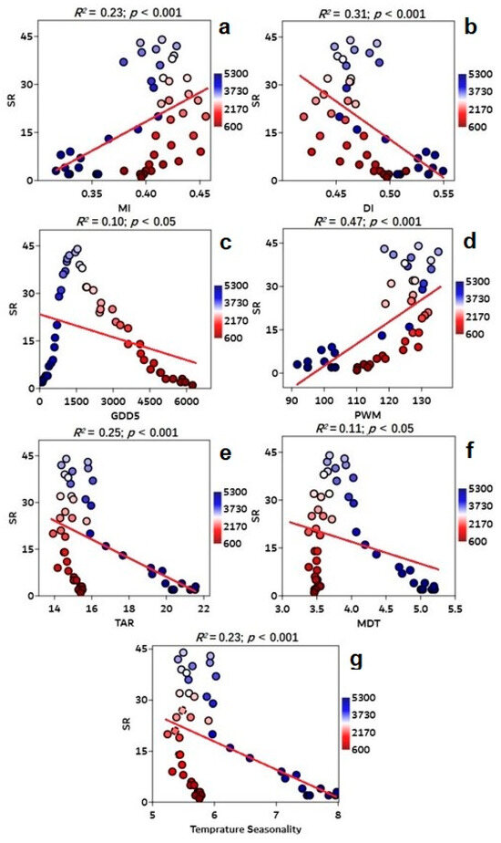Scatter plots showing the significant relationship between species richness on y-axis and various climatic variables along the elevation gradients, i.e., (a) MI (moisture index), (b) DI (drought index), (c) GDD5 (annual growing degree days above 5 °C), (d) PWM (precipitation of the wettest month), (e) TAR (annual temperature range), (f) MDR (annual mean diurnal range), and (g) temperature seasonality on x-axis. Regression models describe the significant link between species richness and climate variables by fitting a red line to the data. The significant R2 value represents the regression model’s explanatory power. The scale color represents the length of the elevation gradients (100–5300 m a.s.l.) in the Qinghai–Tibet Plateau, China.