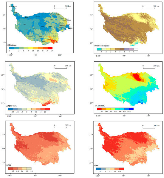 The digital elevation model: (a) gymnosperms richness, (b) altitude, (c) mean annual temperature (MAT), (d) annual precipitation (AP), (e) moisture index (MI), and (f) drought index (DI) in the Qinghai–Tibet Plateau.