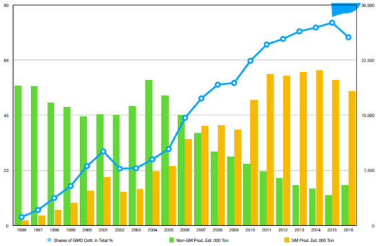Cotton is grown in different states of the USA. The insect-resistant Bt cotton containing Cry1Ac was commercially introduced into the market by Monsanto. The adoption and cultivation of Bt cotton eradicated the detrimental insect–cotton boll weevi and significantly decreased the use of pesticides. With this success later on, both Cry1Ac and Cp4-EPSPS genes containing cotton were successfully introduced into the market [32]. Since 2000, Brazil has become one of the leading countries in agricultural production. Brazil produces different economic crops such as sugarcane, soyabean, coffee, corn, and cotton. During the 1970s−1980s, cotton was grown on small farms in the cerrado province of Brazil, but it was affected by the emergence of cotton boll weevi. Later on in the 1990s, transgenic cotton was adopted on a large scale. Since then, the Bt-cotton production has increased in Brazil [33]. The cultivation of cotton has increased in Turkey since the 1990s. Cotton is grown in different regions of Turkey like Antalya and Anatolia especially in the Aegean regions. Turkey is a pioneer in producing natural-colored and organic cotton around the globe because it has not applied transgenic technology to its cotton production [34]. Bt cotton was commercialized for the first time in Mexico during 1996. After the adoption of Bt cotton in 2008, the 96% cotton field was planted with Bt cotton. In Argentina, after the adoption of the transgenic soyabean, Bt cotton was adopted and cultivated in Argentina. Firstly, Bt cotton was adopted by small farms and families. The cultivation significantly reduced the cost of pesticides and increased the output. Argentina is now one of the global leaders in Bt-cotton production [35].