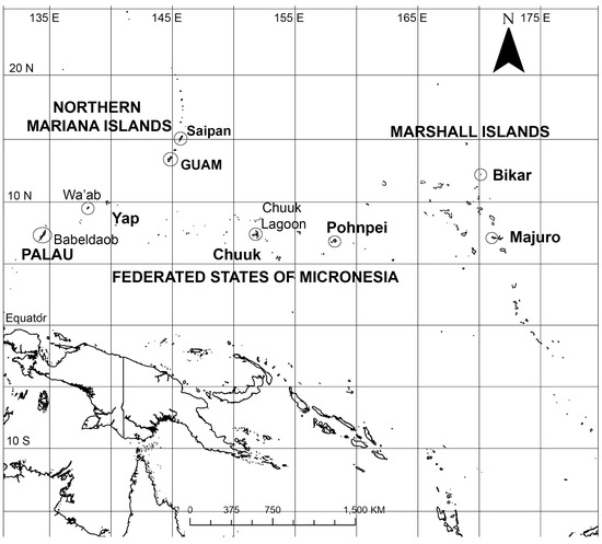 Our ultrastructural studies of conopeate Nitzschia spp. [35], now separated as Homoeocladia [36], revealed high species diversity in a small number of samples from Guam, Mariana Islands, and a different set of species were glimpsed in Yap, Federated States of Micronesia [37]. These results suggested that there might be enough diversity to look for species flocks within the region. Micronesia extends 4000 km across the western Pacific Ocean from Palau to the Marshall Islands (Figure 1). Comparisons with other regions will not be possible until similar ultrastructural studies can be conducted elsewhere. We collected additional samples from Guam to provide a broader baseline and examined existing herbarium accessions and new samples from Palau to the Marshall Islands.