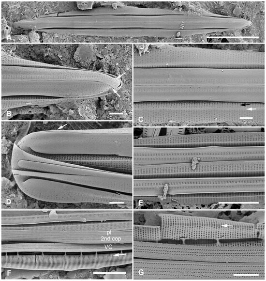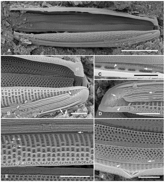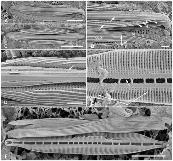 Morphology: Valves lanceolate, weakly rostrate, 24–31 µm long, 5–6 µm wide, striae 50 in 10 µm (Figure 7A,D), fibulae 9–10 in 10 µm (Figure 7D), irregularly spaced. Striae of quadrate to transapically elongated areolae occluded at the outer surface, virgae thickened into transapical costae each with a papilla on the proximal end (Figure 7B,C,E,F); shallower thickenings sometimes on distal vimines (Figure 7B,F); pitted border on valve (Figure 7F). Areolae in peri-raphe zone visible only as slits at edge of conopea, continuing to the apex (Figure 7B,E), along with second row of areolae (clearly visible only in a partially eroded valve, Figure 7E). Raphe raised between two costae (Figure 7E,F). Conopea uniformly wide, smooth. Internally, basal silica layer infilled uniformly, leaving small round foramina; longitudinal break in striae at base of keel (Figure 7D,E). Girdle bands: broad valvocopula and 2nd copula with 3–4 rows of large pores decussately arranged and with papillate borders, pleura narrow (Figure 7B,E).