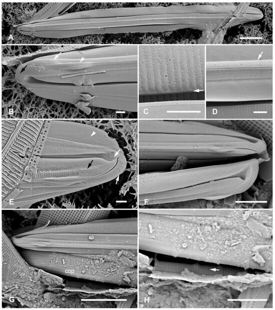 Morphology: Valve lanceolate with long rostrum and shallow keel crest, length 39–51 µm, width 6 µm, striae parallel in middle becoming strongly radiate toward apices (to 15° from perpendicular), 50 in 10 µm (Figure 4A–D); fibulae not seen. Raphe between prominent costae that extended over the keel crest. Two short costae near apex, separating edge of keel from top row of areolae that become a row of small pores going down to the mantle, the other costa partially between the two rows of areolae (Figure 4B,E). The paired areolae extended a short distance toward the center from the keel crest but the rest were filled in. Areolae on exposed valve–mantle face opening externally by transapical slits, on the mantle separated by low ridges on the vimines. Internal view only glimpsed in Figure 4E, internal silicification appears regular. Girdle bands probably comprising two wider copulae with three rows of areolae separated by low ridges (Figure 4E, arrow) and a pleura with 1 row of areolae and no ridges (Figure 4E).